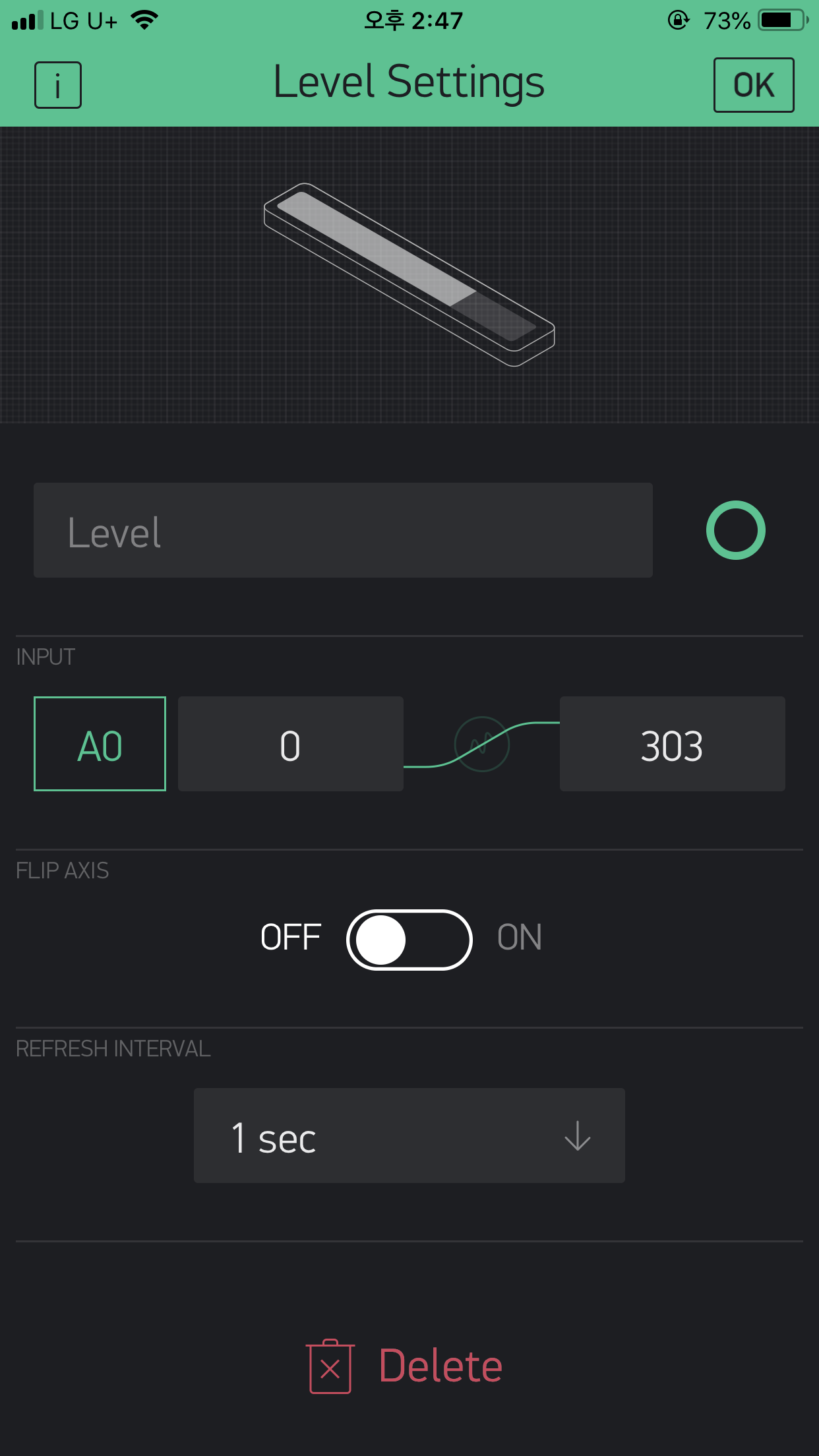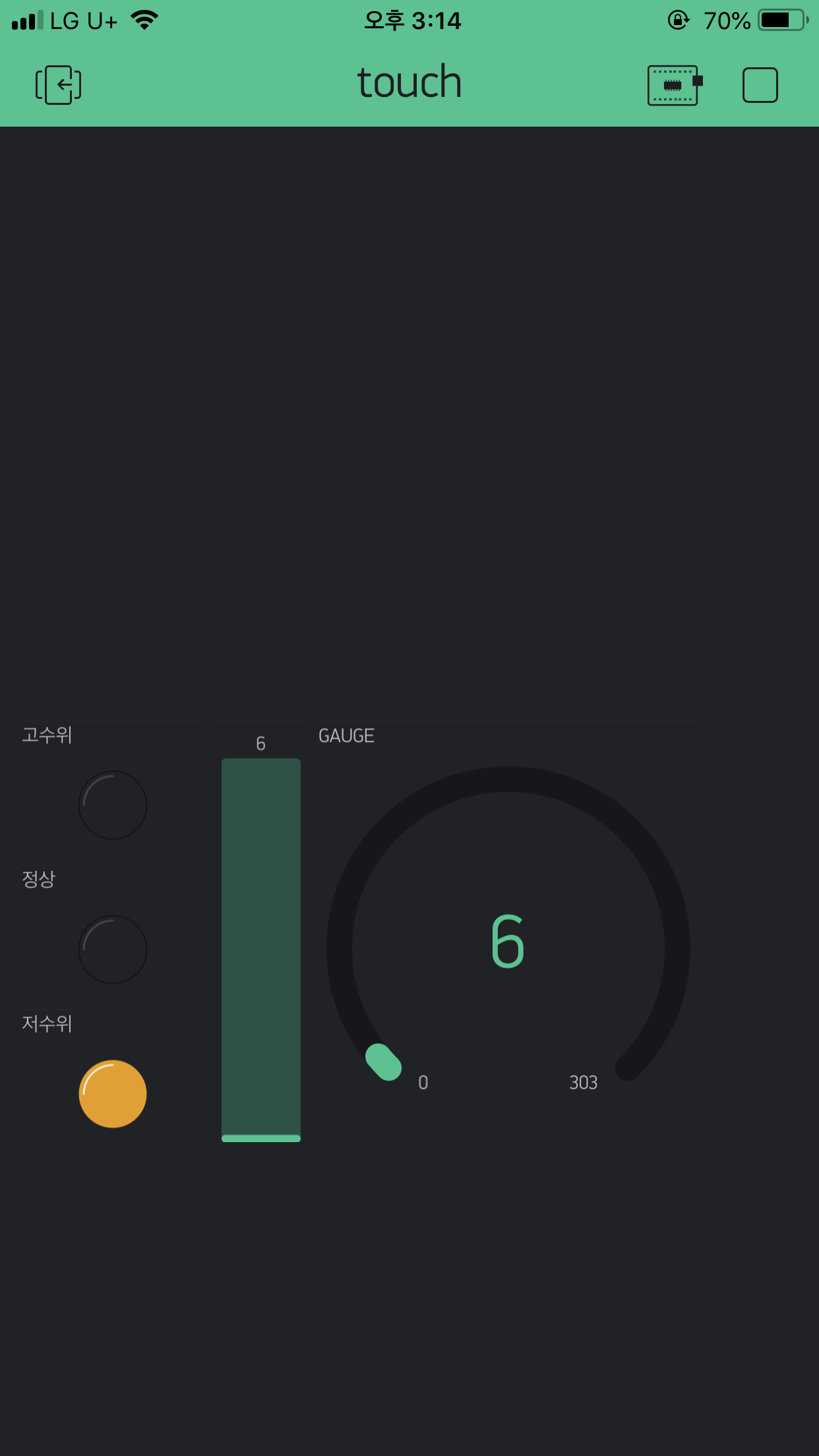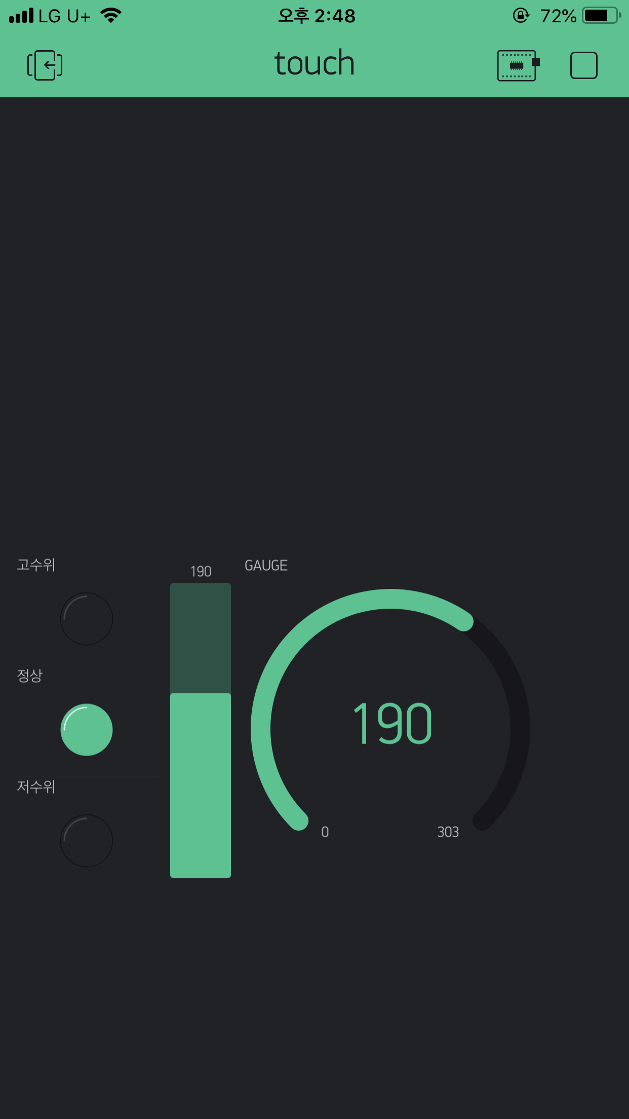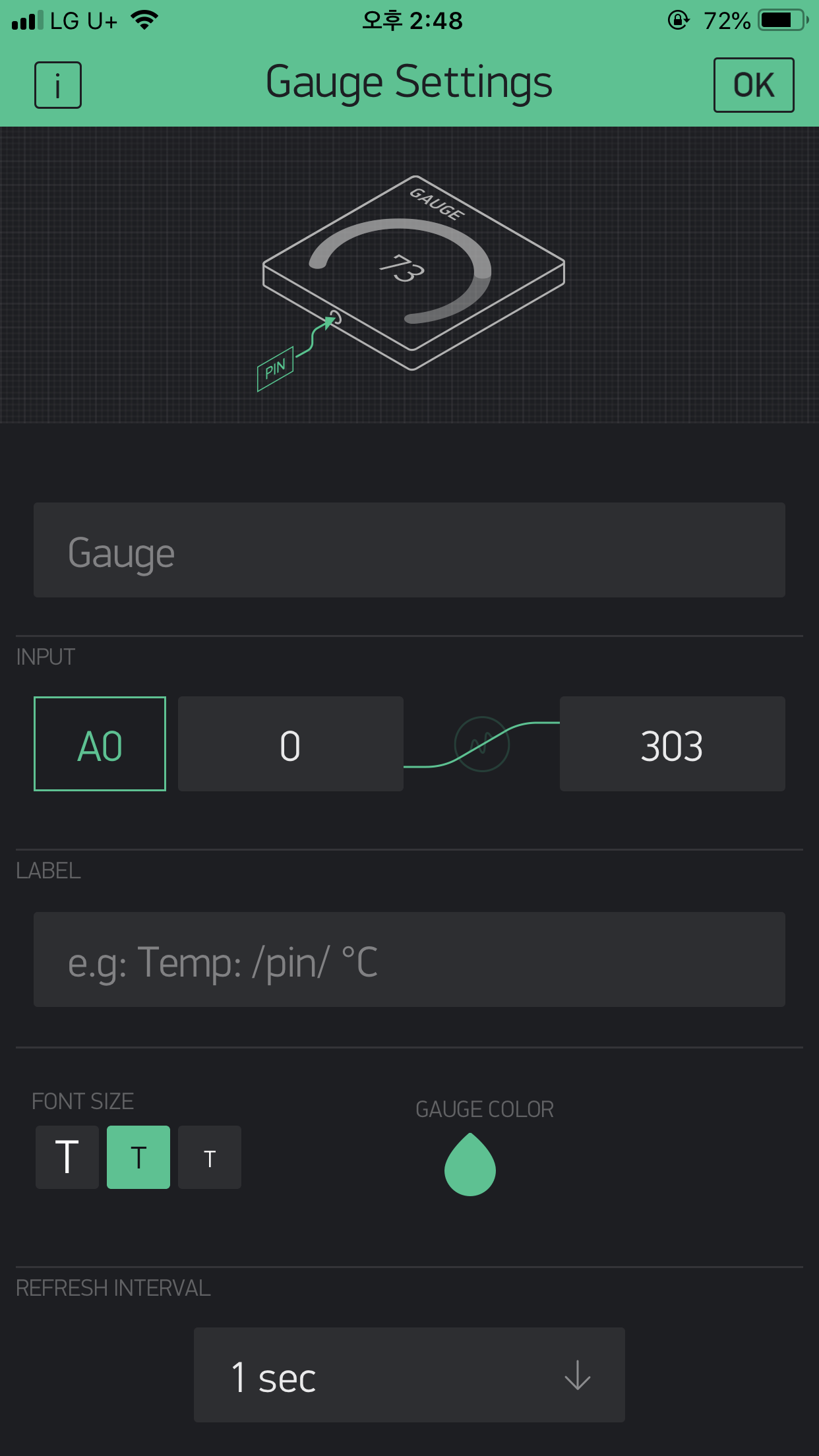 1. 게이지 설정 : 아날로그 값은 0부터 303까지 ( 센서 최초반응값 최대치 )