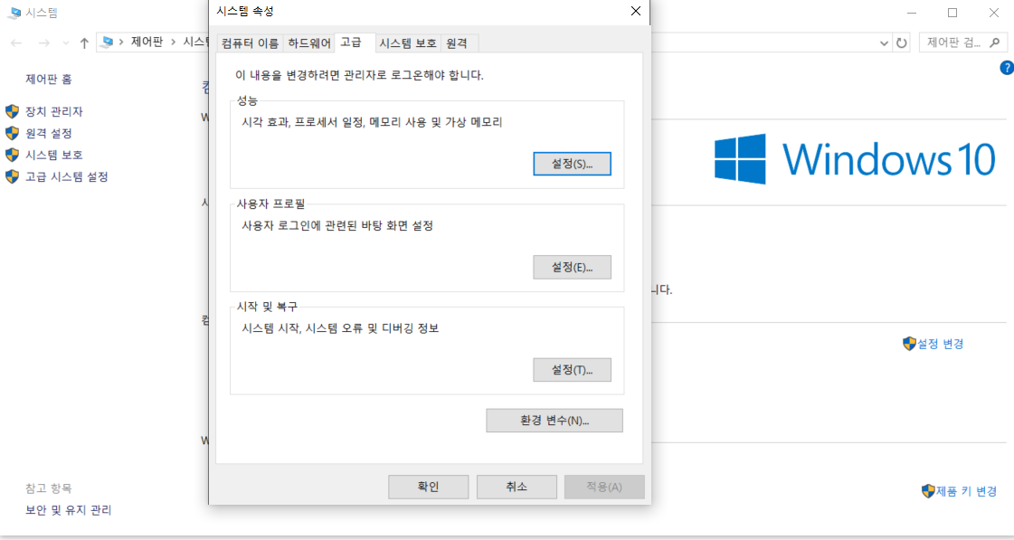 [윈도우 버튼] - [내 PC] - [마우스 우클릭] - [속성] - [고급시스템 설정] - [환경변수]